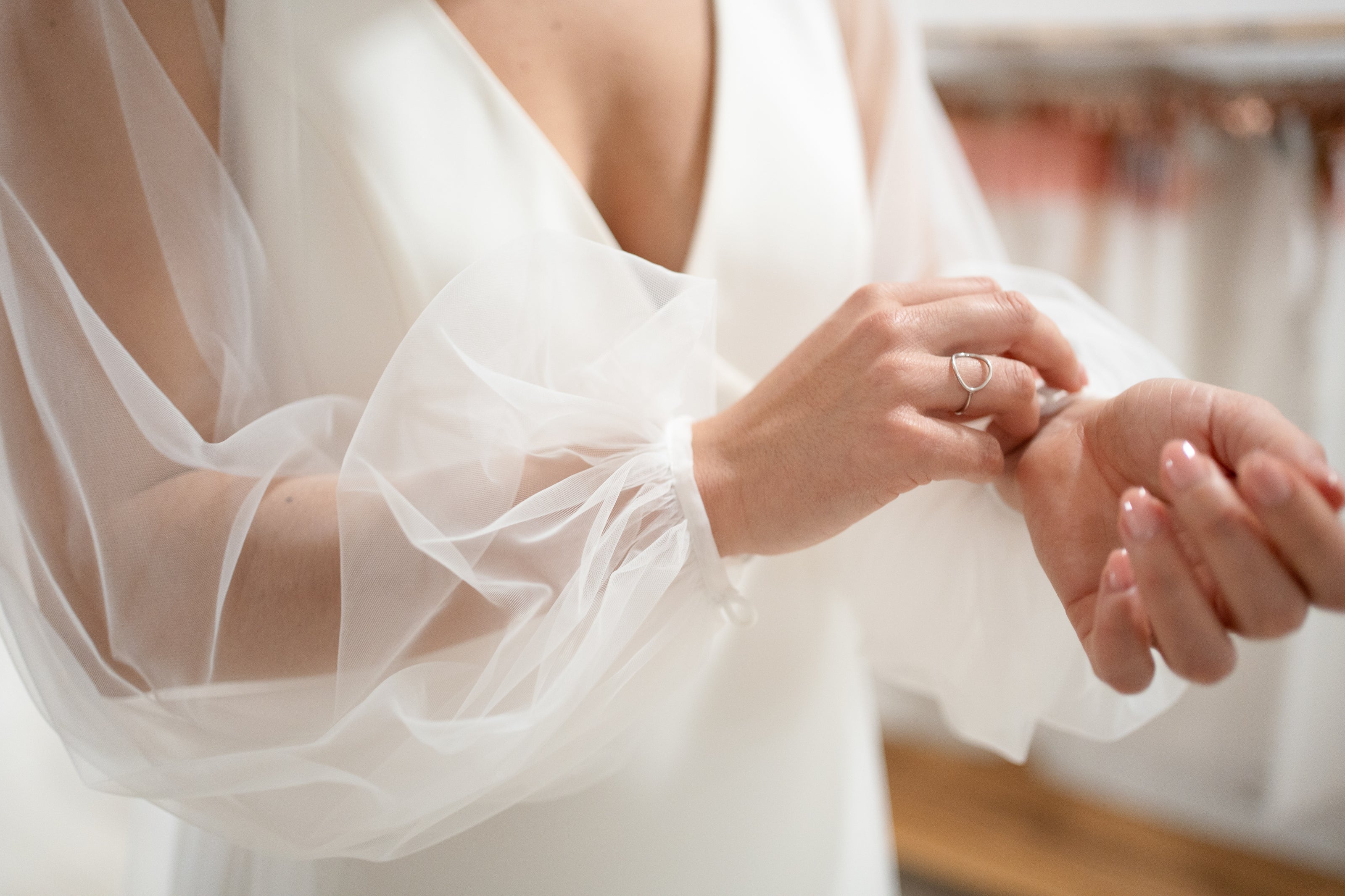 We design pieces that can be altered, transformed, or simplified after the wedding. A train can be removed, a dress shortened, a layer reworked. The goal is not to preserve the dress untouched, but to allow it to continue living.