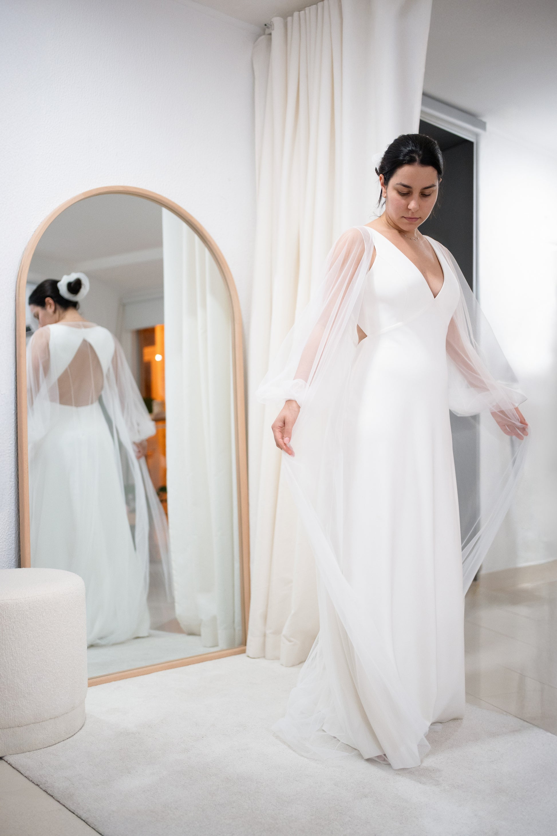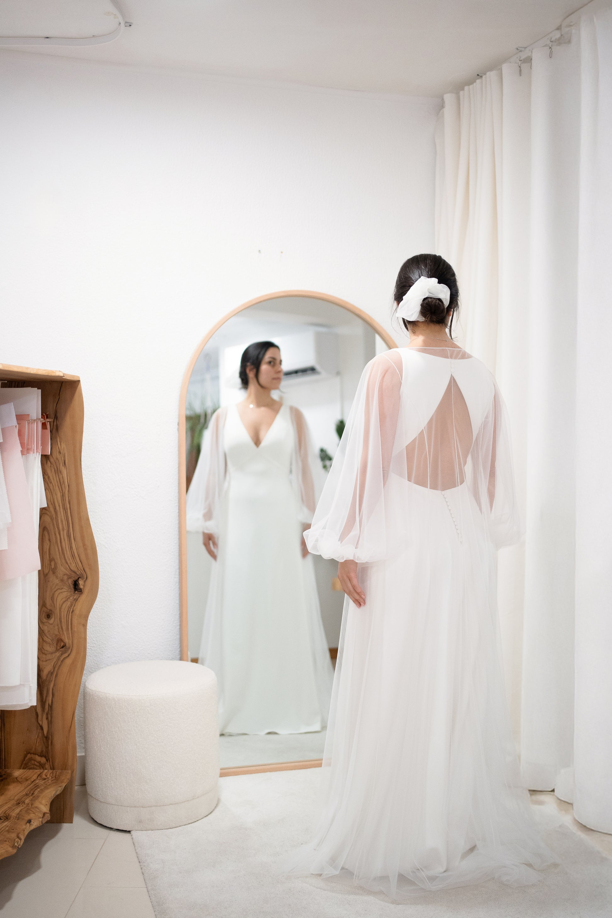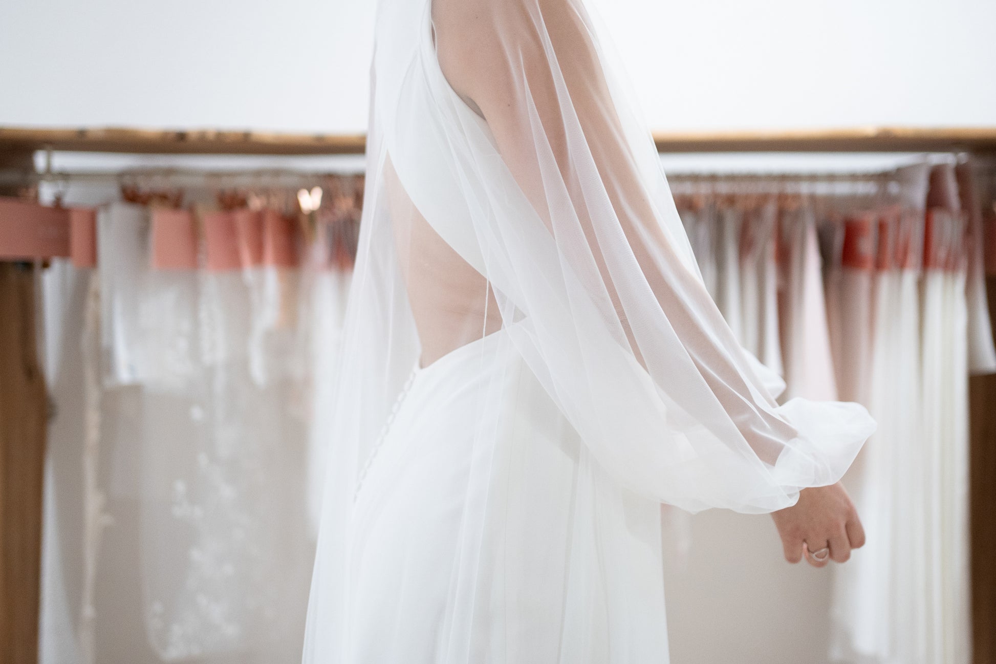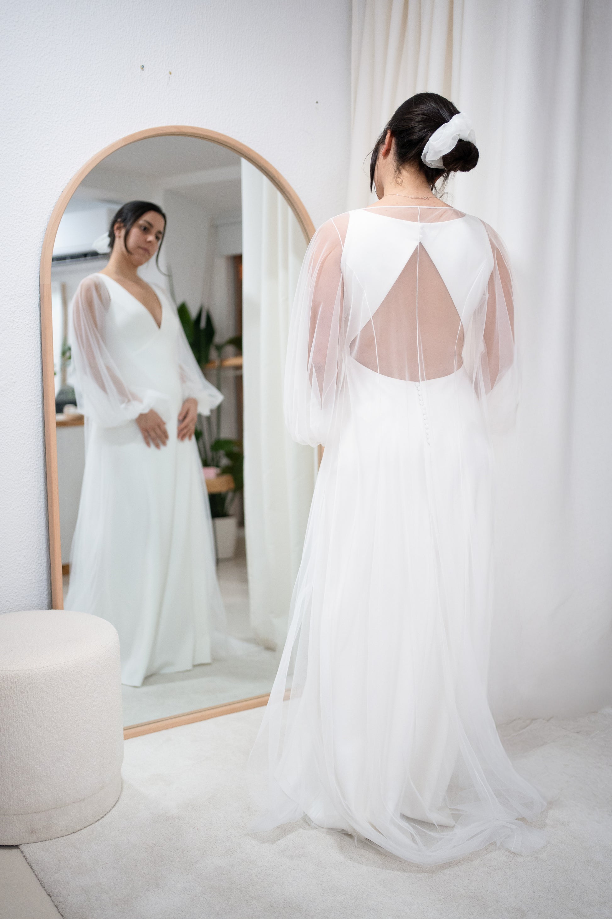 - Bishop sleeves with 1 cm wrist cuff and a single covered button